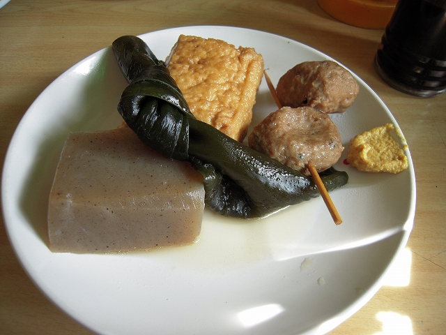 おでん鍋の出汁は、比較的透明感のある醤油系の色でし。が、油膜がすげいでし。写真にはありやせんが、この後大量の肉が投入されておりやした。これがこの油膜をつくりだしているのでせう。牛すじなのか、はたまたやきそば用の豚肉なのか判りやせんが、見た目にはこれがひぜうに個性的でした。