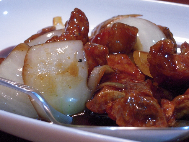 これもんまい! 揚げた豚肉はとうぜん揚げたてでし。黒酢のたれも酢の主張も甘味も塩かげんも脂っこさも全て控えめといふかちょうど良いといふか、素材を味わうための味付けである、といった感じでし。揚げた肉のあとのたまねぎが、すこーしだけ生の感触を残しており、さっぱりさせてくれやし。