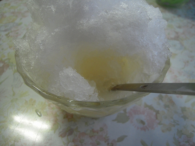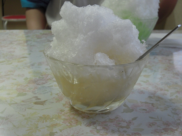 先ず氷でしが、『広栄堂』の氷と比較して、キメの細かさは殆ど同じでした。が、少し尖っているといふか、細長い印象でし。巧く表現できやせんが、むしろこちらのほうがかき氷っぽい氷と言えるのかもしれないでし。量は『広栄堂』の氷と比較して少なめでし。安いので対費は同じくらいかと思いやし。