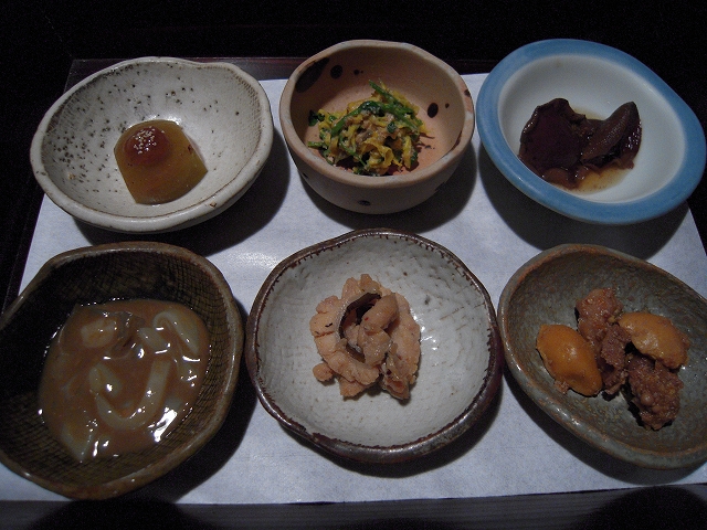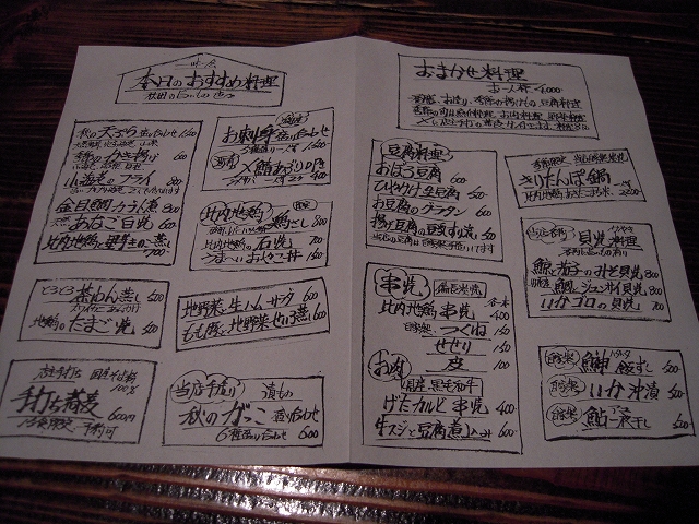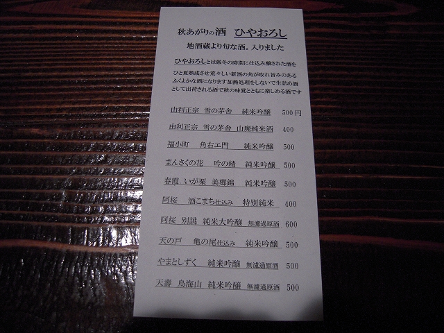 えー、思いっきし忘れやした。めずらしく。印象深かかったのは、にしんでしね。あっしはあんましにしんの煮たのは好きではないのでしが、結構煮詰めてある割りには甘味もしょっぱ味も抑え目で、にしんの風味がエグくならないやうに、旨みが引き出されておりやした。ビールよりはお酒でせうね。