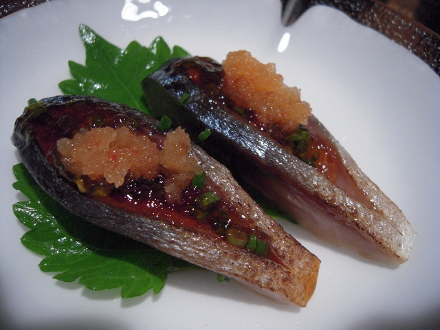 これはんまいでし! 〆具合は、ん。の〆鯖のそれと似ていて、硬くならない程度の〆でし。ん。のご主人は酒盃OBと伺っておりやし。すし匠みたいでしね♪ だいこんおろしとぽん酢ジュレも良い塩梅でし。ちらっと炙ってあることによりこれらの調味料が活きてくる感じでしね。これはお造りではなく、りっぱなお料理でし。