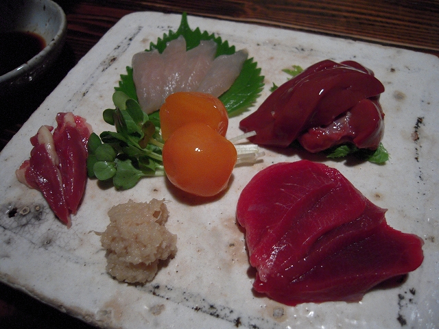 これまた小さめに切られた鶏の刺身でし。なかなかよそではお目にかかれない逸品でしね。レバーも砂肝もまったくクセがないでしね。これは私見でしが、この酒肴だと、クセの強いお酒がよいのかなーと思ひやした。あとはしょうがとしょうゆ以外になんか食べ方があると楽しいのでしが。