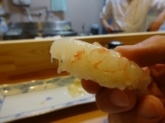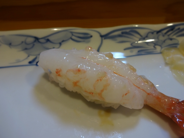 これはしょうゆを付けてとのことでした。かなり大きいぼたんえびでし。ぼたんえびは甘えびに比べると当然大きい分、身の食感が生々しいでし。これを、ご主人はとある技法で下仕事しておりやした(どうしたかはひみつ)。このお仕事のおかげで、ぬめり感と生々しさは抑えられ、ひぜうに小気味よい握りになりやした。技法のおかげか、しゃりと合わさったときの苦みも、ほとんどなかったでしねー。