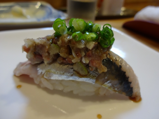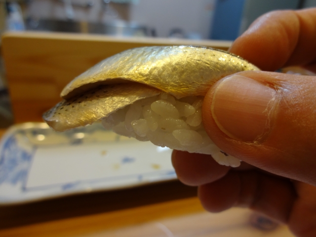 これは、最初にたたきを作られ、いったん冷蔵庫にしまわれやした。その後いわしを仕立てて握ったあとに、乗せておられやした。