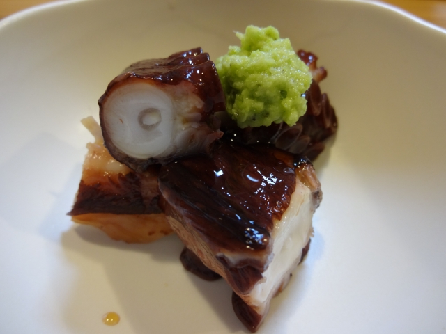 桜煮といふよりは、もうすこしあっさりした煮物でし。だしのかほりが身に染み込んでいるといふものではなく、つめの味でいただくものでした。極限までやわらかく煮こんでいるのではなく、あくまで『たこ』である雰囲気といふか、歯触りが残してありやし。つめでしが、甘味が強めで、最初にこれが来やし。しかし、この甘味はライトボディであり、すぐに引いていきやし。んで、最後にピリッと辛みがありやした。たぶんなにか辛みが入っていると思ひやし。なかなか鋭敏な一品目でした。小腹にもよいかと。