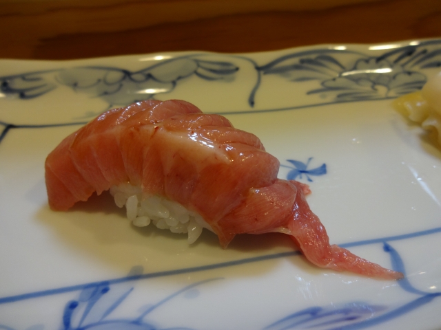 握りの一品目はまぐろでし。12kgぐらいのめじとおっしゃっていたやうな記憶がありやし。腹側の身なので、とろのやうな見た目でしね。握りの大きさは江戸前サイズでし。煮切が塗ってありそのまま。