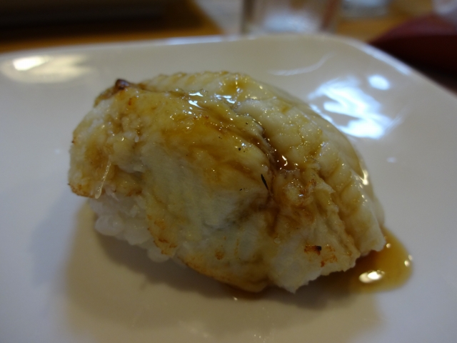 炙ったぶん香ばしいのでしが、これは全面に出ているものではなく、ひとつの〆方のやうなイメージでした。つめはたこのところでも感じたとおり、甘めでしがすぐに消える、軽めの甘めでし。やっぱり最後にピリッと来やした。これは焼きあなごでもなく、煮あなごでもない、なんともいえないものでしたね。身のほぐれ方もほろほろではなく、堅くなく、皮目もあまり主張しない、上品なつめのあなごでしね。軽めの印象が多かったので、この辺からシフトチェンジなのかもしれやせん。