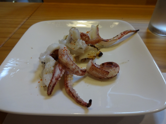 これでしが、表面はすこーし焦がしてあり、香ばしいかほりがよく出ておりやし。もう少し内側がすこし加熱されており、中心部は生の感覚が残してありやし。いわゆる焼き魚ではなく、おつくりの延長のやうな印象でし。げそ=おそうざいチックにとられがちでしが、りっぱな肴でしね。上記の火加減なので、やわらかくうまみ抑え目でし。前半によい出され方でし。