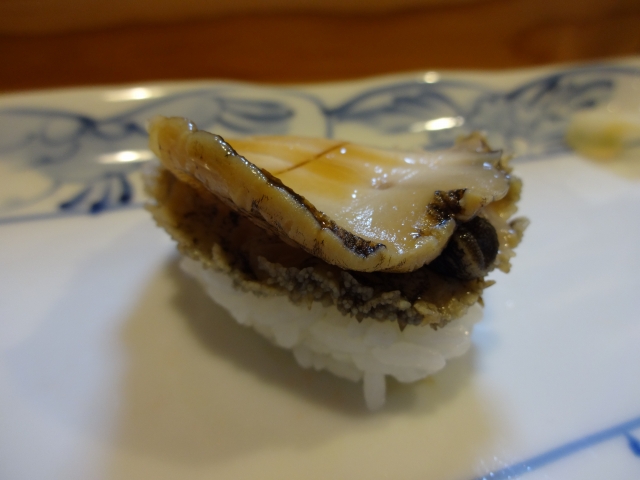 煮切が塗ってありそのまま。ご主人があまり多くを語らなかったのでしが、黒鮑とおっしゃっておりやした。型は小さ目でしが、十分んまいでし。つまみではないので、すこし歯ごたえを残す印象でし。出汁もあまり染み込ませていないでし。仕込みの時間もあるのでせうが、握りならこれでよいなーと思ひやした。しゃりとの相性もすげく良かったでし。