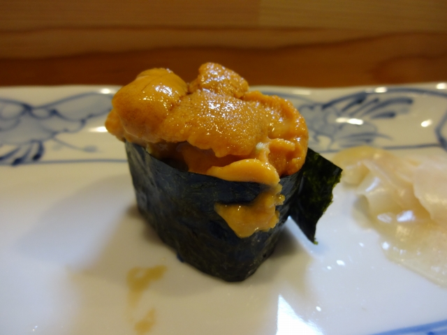 煮切が塗ってありそのまま。箱を見ると、カラフルなうにでした。この時期のうにはベストタイミングでしが、意外とあっさりしておりやした。鮮度は抜群で、しゃりと合わさって苦みのない、ひぜうにんまいものでしたよ。