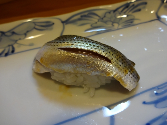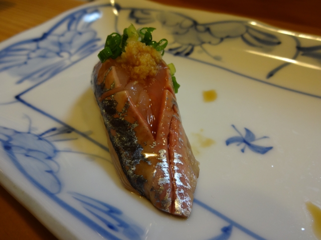 良いあじが入ったとのことで、ご用意されたとのことでした。けっこう大き目の型でしたね。これも鮮度がよく、うまみは抑え目でした。血合いの感じが一様に鮮度を物語るものばかりでし。青物=生臭いといふ意識があり、苦手な方にはうってつけでせう。これもしゃりとのバランスをよく考えてあるネタの大きさ・仕立てでした。