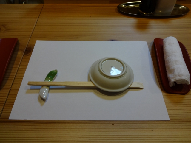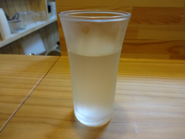 角地のかどに入口がありやし。中に入ってみると、カウンター4席があり、あとは板場だけ。ひぜうにちんまいお店でし。出来たばっかりのお店なので、内装はひぜうにきれいでし。イスがもう一個用意されており、最高5人まで座れやし。その際は、一番左端の方は、板場の出入り口のはねあげの上でいただくことになりやし。
