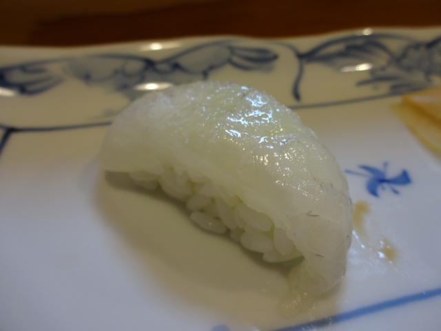 二枚づけでし。煮切が塗ってありそのまま。これは〆がひぜうに巧みだなーと、思ひやした。酢も塩も全く残っていないのに、しっかり〆ておられやした。型にしてはやわらかく仕上がっており、すんばらしいでし。この型のこはだなら、ちょっと酢を強くして〆れば一枚でも出せるのでせうが、〆が巧いので二枚付けなのでせうね。