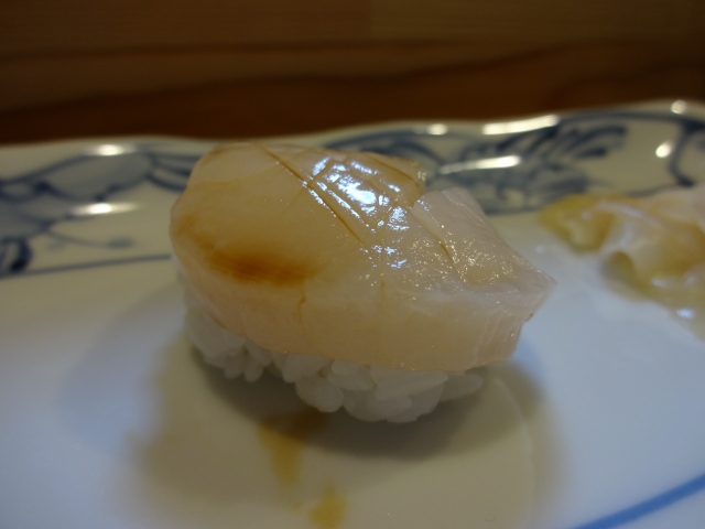 一枚でし。煮切が塗ってありそのまま。これもあっさりでした。ねたは基本的に鮮度を追求しているみたいで、寝かすといふ技法はされていないものと思われやし。これもあっさりしておりやした。ほたての握りは、ねたとしゃりのバランスが崩れると、どちらかの味がかなり強く出るのでしが、これはバランスが良かったでし。