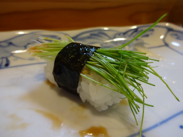 〆の品でし。煮切が塗ってありそのまま。目にも涼やかな〆でしね。かなり若めの目ねぎでしね。これはさっぱりとしており、くせのないものでした。