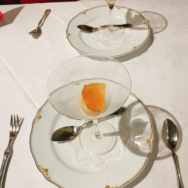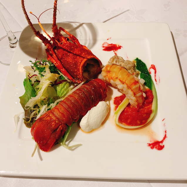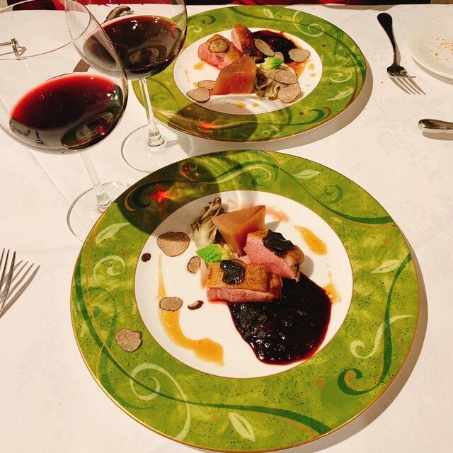 フォアグラカナールのフラン黒トリュフの香り、カニ身のウニ添え、蒸しアワビのポテサラ、蒸しエビと海鮮パテ、黒トリュフのスープ、伊勢海老の高温ロティキャビアを纏わせて、目板鰈のムニエル、フランスシャラン産鴨胸肉のロティピノノワールと木苺のソース、紅玉とアールグレイのソルベ、白根のルレクチェガレット仕立て、黒胡椒と蜂蜜の香りのキャラメルソース、ガトーショコラといちごマカロンのプティフール、エスプレッソと王道のフレンチ、デザートも堪能させてくれる美味しさ。