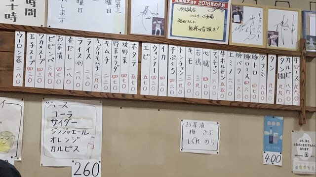 今日は大人4人で伺い、カルビ①、牛ロース②、豚バラ②、若鳥①、キモ①、とんちゃん⑤、ライス大④、ビール大瓶①をオーダーして腹一杯になりました。これで会計は7,570円と激安です。昭和の古き良き時代からある焼肉屋さんで、目新しいものは無いですが味、ボリューム、コスパは最高ですよ。