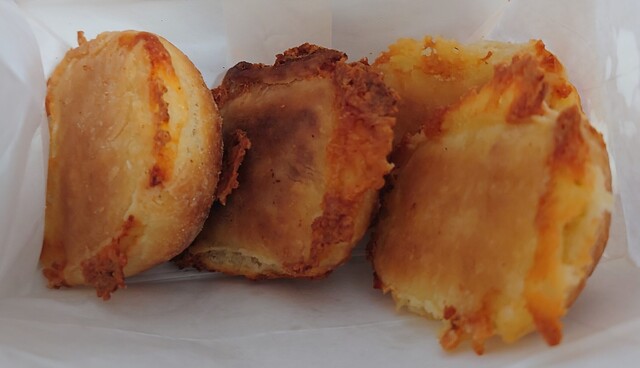 扱うパンは3種類。今回は閉店間際だったので「レッドチェダーチーズのパヴェ」(3円/g)が残ってたので、こちらを6個購入。現在、14時の閉店後は店頭で無人販売をおこなっていますが、その時と同じ価格の500円にしてもらいました。ラッキー。カリカリッとチーズの食感が何ともうまいんよ。