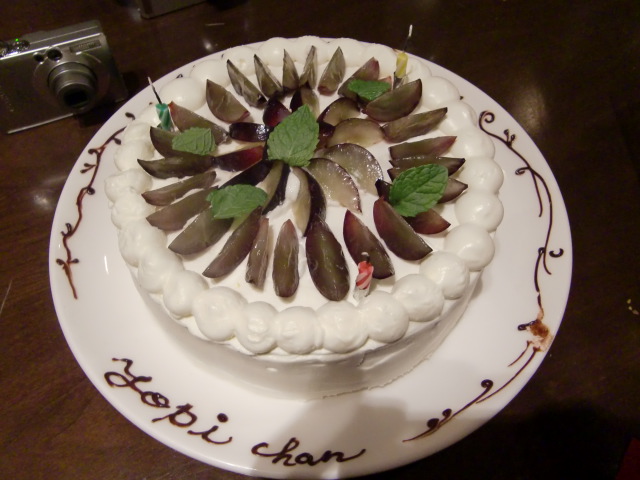 BDケーキは「Happy Birthday yopi chan」と書かれている葡萄がのったケーキ(≧v≦)