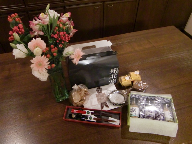 お花は帰ってすぐに飾り、クッキーは翌朝、お塩セット、写真立て、ペアのお箸は嫁入り道具に持
