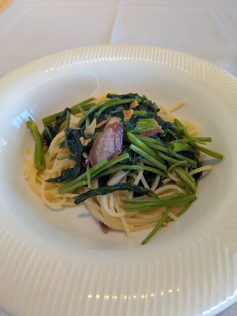 空芯菜とパンチェッタのペペロンチーノ、優しいけどしっかり美味しー
