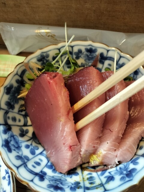 この日は、マグロぶつ、揚げ出し豆腐、当然もつ煮込み。揚げ出し豆腐はしめじやネギが具として鎮座し一椀で酒2合。