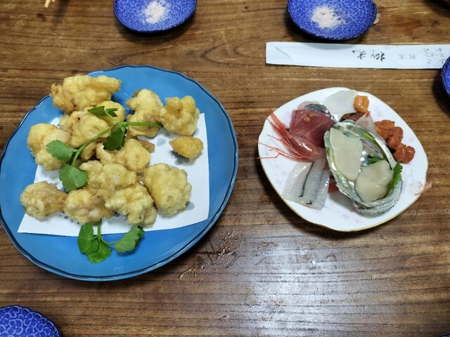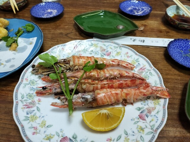電話で刺盛りはお願いしており、前菜、マクロカマの煮付け。鍋はブリしゃぶがオススメと。白子天ぷら、エビ焼き。刺盛りはまさに盛りだくさんな種類の魚が、少し遅れ甘エビ、ヒラメ、エンガワが追加。