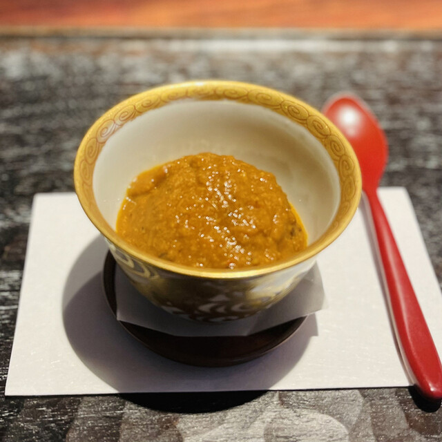 鱈の白子、胡麻ソース、一味