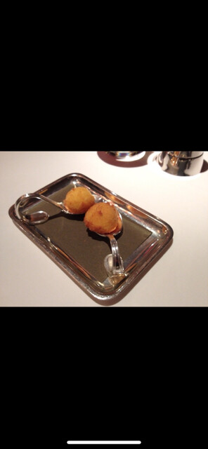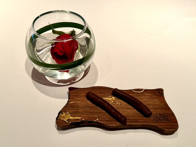 鱒のタルタル、海苔、ピスタチオを組み合わせた、メニューに乗っていない特別なアミューズ。ピスタチオの芳ばしい香りと、鱒の濃厚な脂が印象的で、アミューズとは思えないほど満足度の高い一品。