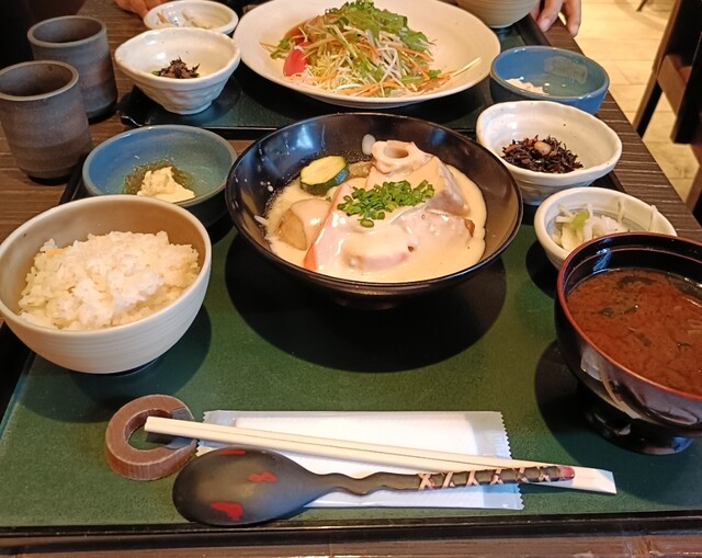 本日のお魚料理はサーモンのシチュー西京仕立て、肉料理は鶏つくねです。シチューには大根が入っていてとても柔らかく美味しくいただきました。ご飯は白ご飯、玄米、炊き込みご飯から選べます。今日はじゃこご飯でした。