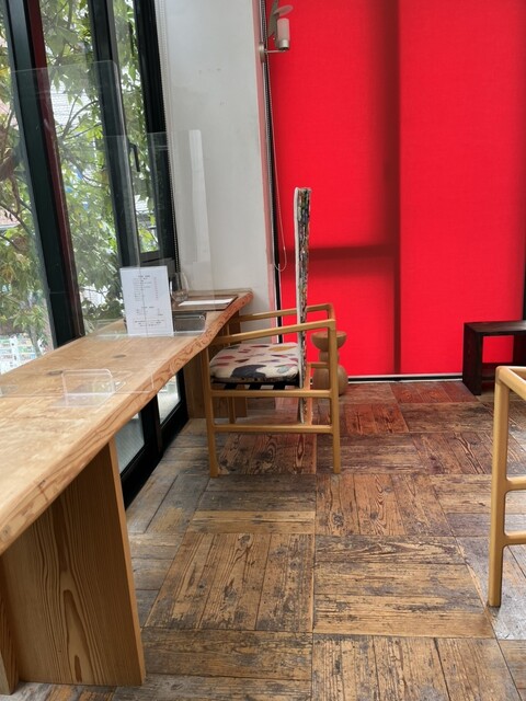 カフェ後の少しスタイリッシュな店内、オープンキッチンは、あるものの、コロナ禍の中、前にカウンターは、無く、奥の窓際に5席ほどと3〜4人掛けのテーブルが2脚