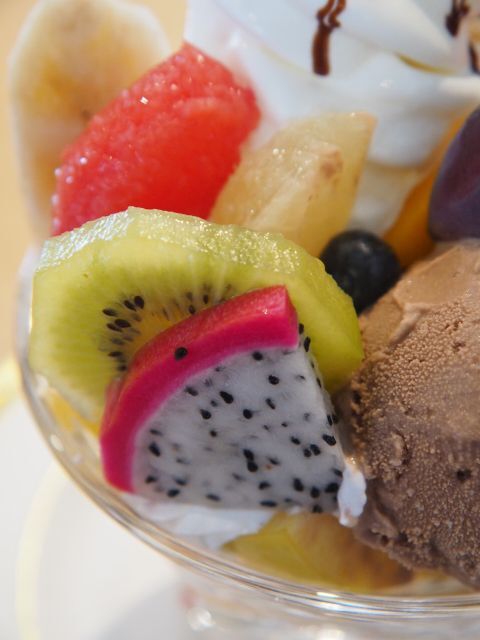 よって、チョコレートアイス、チョコレートクッキー、チョコレートソースを使っているが、基本はフルーツパフェ。様々なフルーツが使われている。まさにフルーツの盛り合わせ。