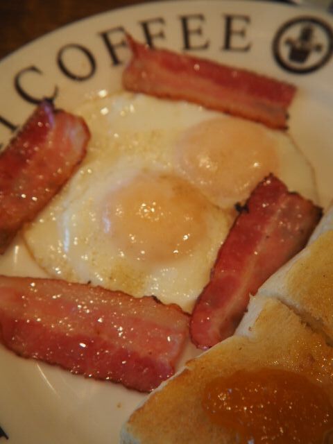 今回はベーコンエッグにしてみた。目玉焼きは、玉子を2個使っていた。