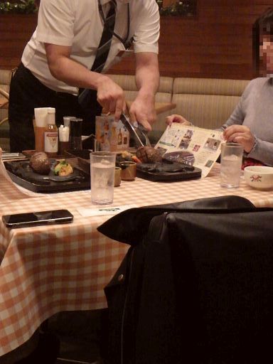 提供の時点では、ハンバーグというより表面を軽く焼いた挽肉の塊が熱々の鉄板皿に乗っているだけで、どうやって食べるのかと思ってしまうが、直後にスタッフが直後に挽肉の塊を上下半分にカットし、鉄板皿に押し付け、ソースを掛けて完成させる。これにより、鉄板皿にはハンバーグが2つ盛られた状態になり、漸く食べられる形になる。