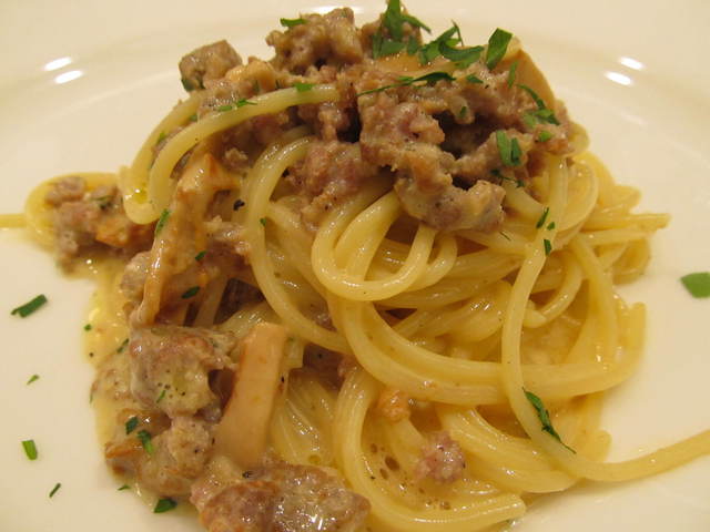 自家製ソーセージとジロール茸のカルボナーラ