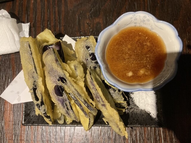 更におつまみには茄子の天ぷらを塩とケチャップマヨネーズの食べ比べがいいですね。