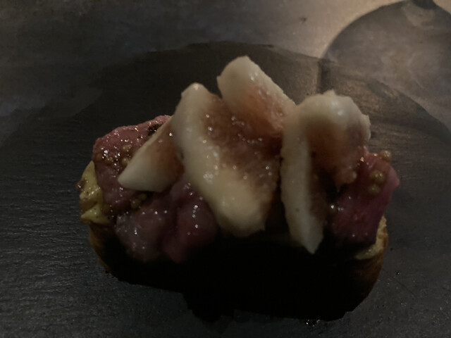 和牛ローストとイチジクのブリオーシュ乗せ トウモロコシとマスタードソースで