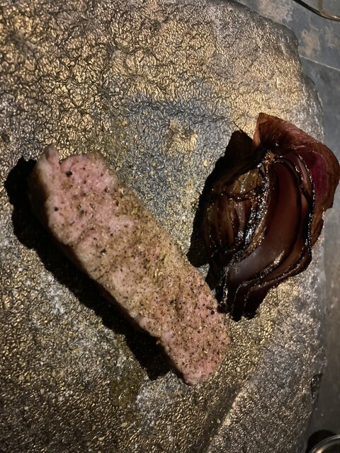 宮城県の地震の時にかろうじて何匹か生き残ったイノシシに近い絶滅危惧種の豚と新玉ねぎの付け合わせ、これには「而今」と「産土」を合間に挟んでからの、島根県の「玉櫻」をお燗で、イノシシに近い豚さんは噛めば噛むほど旨味が出て来て、燗酒との相性は絶品です。‼️❣️‼️❣️