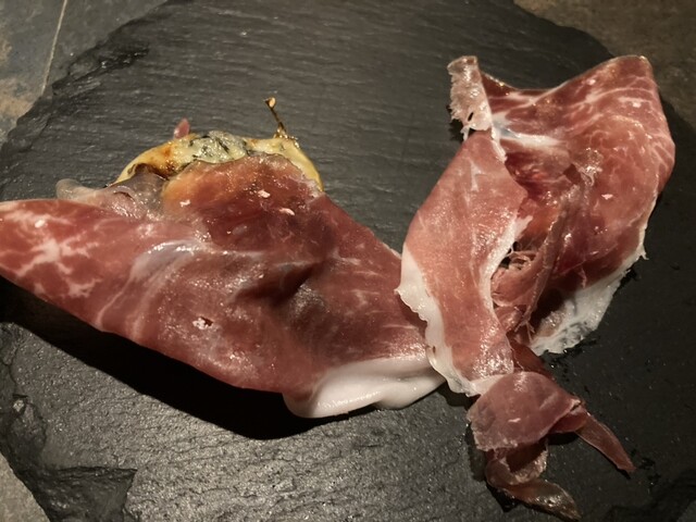 次のお酒は平戸の「HIRAN」です。それに合わせた次のお皿はBLACK TAGのオーガニックイベリコ豚の生ハムに季節の最高級イチジクとブラジル産ゴルゴンゾーラと果実ジャムを合わせた絶品、今しか無い一期一会のコラボ、馬宮スペシャルのお料理でした。このオーガニックイベリコ豚のハモンセラーノは柔らかで絶妙な塩味と旨味が口の中に広がり、素晴らしい口溶けの、「今まで食べていた生ハムは何だったの?」と言いたくなる食材で、暫くの間ゆっくり生ハムのみを食べ続けては酒を飲み余韻を楽しんで、至福の時を堪能させていただきました。その後イチジクと合わせて食べると更にその旨さが引き立ち、天国に登る気分です。
