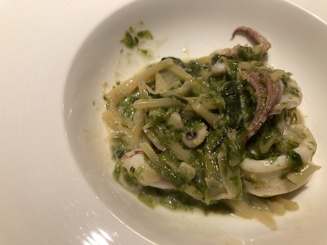 イカと青海苔のパスタ ヴォライユのソースと塩のみこれを我々持ち込んだ、蔵初仕込みのオークションで買った「甍(いらか)」で深みのある甍とヴォライユのソースが素晴らしいハーモニーを奏でます。‼️❣️‼️❣️