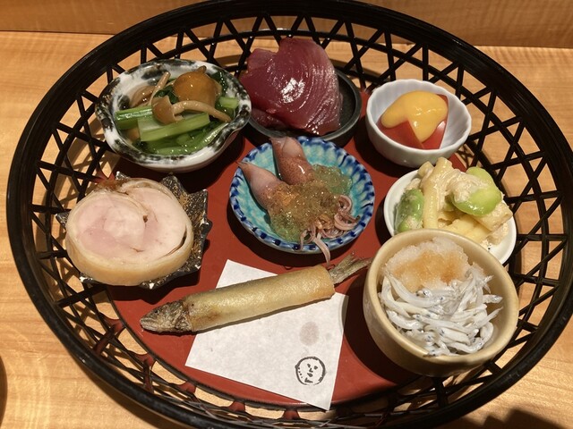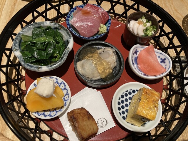八寸 白子 しまがつお 生シラス 紅大根 芋唐揚げ チヂミほうれん草 出汁巻卵 春菊白和え