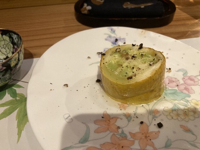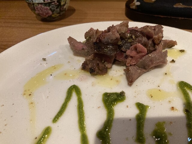 ジビエは何と我が人生初のキョンのソテー、臭みも無くて、こだわりの塩だけでも旨いのですが、更にこだわりのニンニクの葉とオリーブ油のソースが素晴らしい。‼️❣️‼️❣️これと古酒のマリアージュが至福の時をもたらしてくれます。‼️