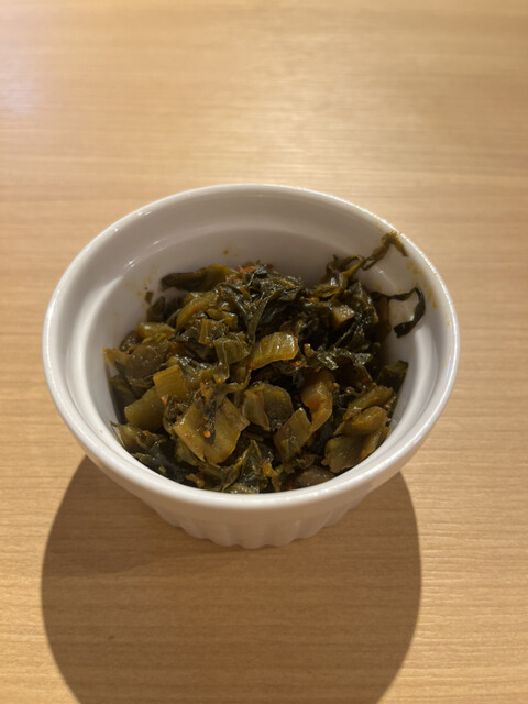 そして具。チャーシューは薄目ながらもしっかり肉感も味わえてスープもまみれてうまい。ネギは別皿たっぷりでスープまみれでたまらん。味玉は輝くオレンジ色。スープがよく黄身に浸ってまろやかうま。高菜はどんぶりに入れるとスープの味が変わりすぎるので、レンゲでスープをすくい、そこに高菜を浸していただきました。量もたっぷりでうれしいし、高菜自体もうまい。辛すぎず、シャキッとして食べさせる高菜。