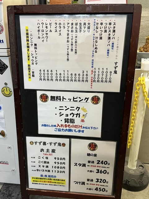 ということで、今回は夜のすず鬼。到着すると、うわ行列が。とりあえず階段の中段に並びます。しばし待つと、列が進み券売機購入のところまで来たので、券売機にいき、スタ満そば970円にまさお60円の計1030円を購入です。列に戻ろうとすると、自分のところまで13人、後で確認すると店内で4~5人いたので、階段中段まで3人くらいはいたので20人以上待ちだったと分かります。ちなみに帰る時には階段の一番上から踊り場まで並んで35人くらいいました。すごい人気ですね。
