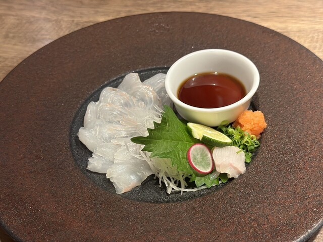 そのあとは、旬魚のお造り ヒラメの薄造りを注文。ポン酢と共にあっさりと臭みもなく、ネギや柑橘などの薬味といただくヒラメは特にこの食欲がなくなる暑い日々に食べやすく、選んで大正解!