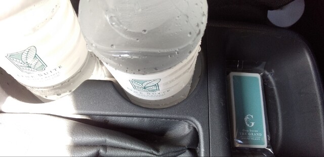 バレーサービスで用意してくれた車内にはお水をセットしてくれています。 沖縄のリゾートホテルでよくあるサービスで、ありがたいです。コチラではオリジナルタブレットも。