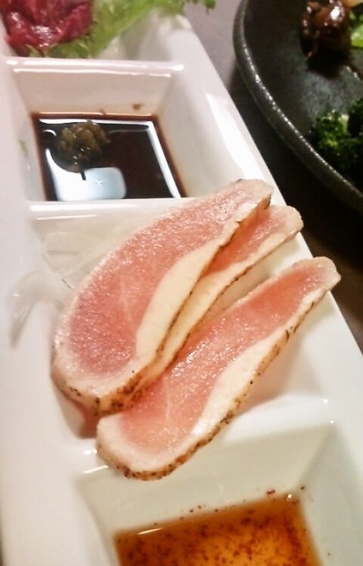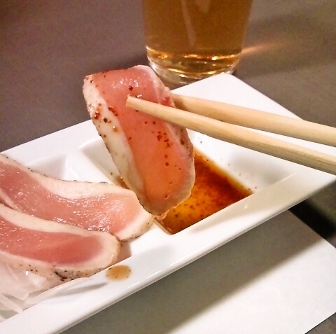 宮崎地鶏のタタキを辛味を効かせたポン酢でいただきます。