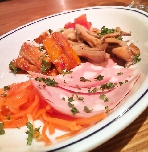 イタリア産のモルタデッラハムと、人参のマリネ、カポナータ