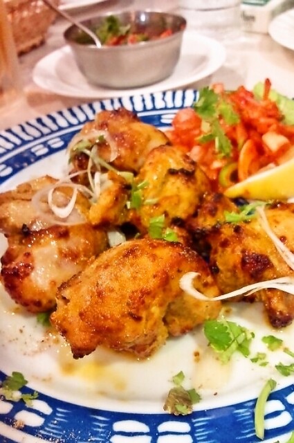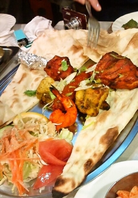 タンドリーチキン、タンドリープロウン(海老)、フィッシュティッカ、シークカバブ、ナン、サラダの盛り合わせです。