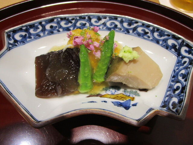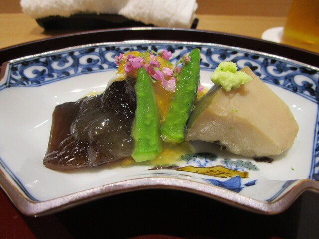 先付の蒸し鮑は島根産だが、その分厚い身とその柔らかい食感は見事だった。